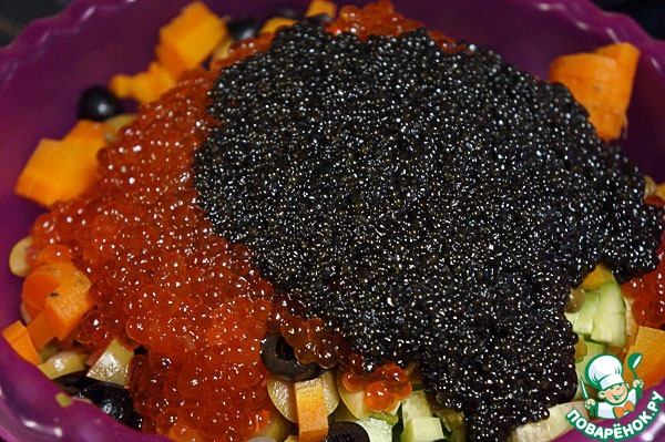 Икра в салате (не только в оливье) - дело вполне обычное, два вида - так ведь вкус у них совершенно разный! Блюдо и правда богатое по вкусу и по ингредиентам - так ведь для того и задумано