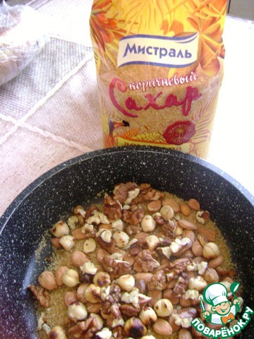 Для этого в сковороду с хорошим покрытием насыпаю сахар – тут просто чудесно подходит демерара от ТМ «Мистраль» - замечательно карамельный вкус дает. Кладу орехи, уже поджаренные заранее, и маленький кусочек сливочного масла. Ставлю на огонь и, помешивая, расплавляю сахар и чуть его провариваю. -