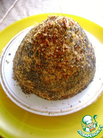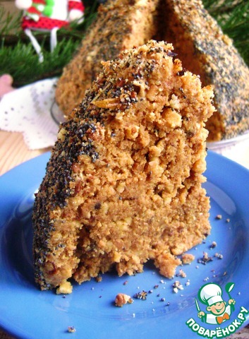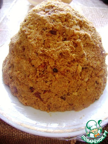 Из полученной массы формирую горку-муравейник, слегка утрамбовывая конус. Удобно это делать на большом блюде, покрытом пищевой пленкой. Ничего не просыпется за края и будет легко перенести торт на красивое блюдо.