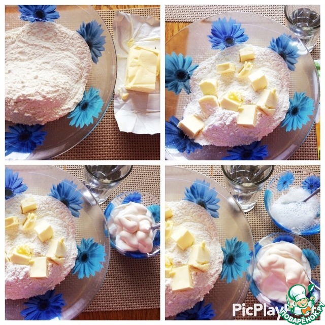 просеиваем муку, нарезаем масло кубиком, руками перетираем в крошку. Добавляем майонез и сметану.