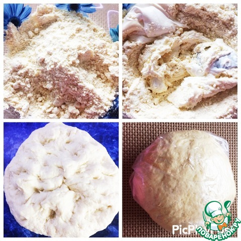 Формируем из теста колобок, заворачиваем в пищевую пленку и отправляем в холодильник, пока готовим начинку.