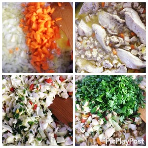 Смешиваем мясо тушеное с капустой, я еще добавила грибы (остались от салата).