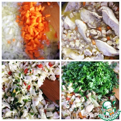 В другой посуде тушим капусту с зеленым луком и болгарским перцем, солим, перчим по вкусу, добавляем рубленую зелень.