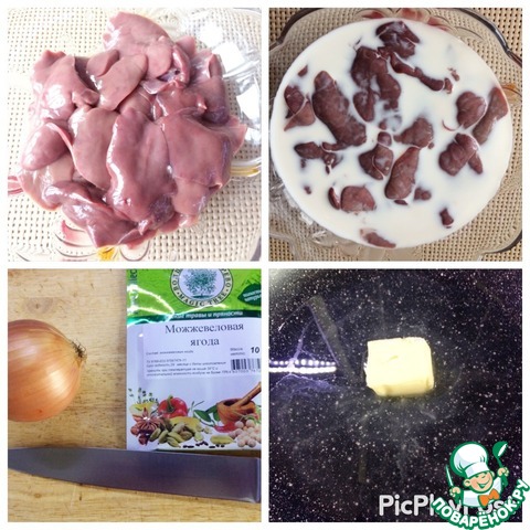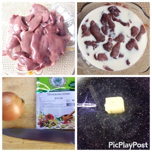 Печень тщательно моем, чистим от всех лишних пленочек и вымачиваем в молоке минут 20 — 30. Чистим луковицу.