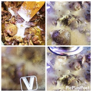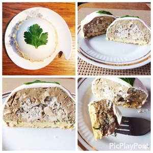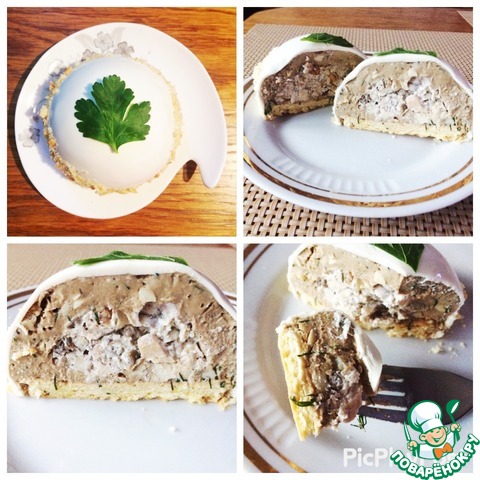 К полученной массе добавляем остывший желатин, перемешиваем. Сметанно-желатиновую смесь добавляем к мясу с грибами и опять все перемешиваем.