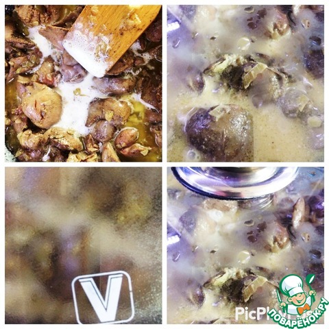 Добавляем сливки, перемешиваем, солим, перчим по вкусу, накрываем крышкой и тушим печень на маленьком огне до готовности.