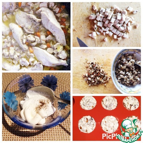 Готовое филе нарезаем кубиком и смешиваем с грибами, добавив горсть рубленых грецких орехов.