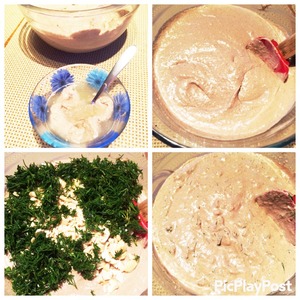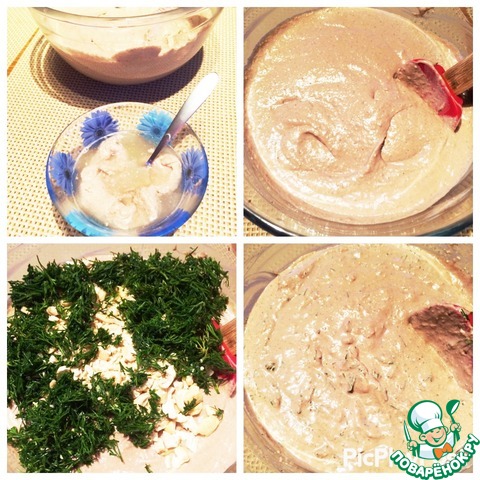 К остывшему желатину добавляем немного печеночной массы, перемешиваем и уже затем отправляем в миску со всей печенью, тщательно перемешиваем. На этом можно и остановиться, но я решила добавить еще рубленый свежий укроп и горсть орехов кешью.