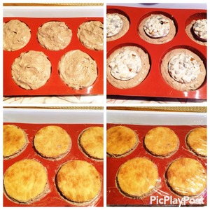 выкладываем в большую силиконовую форму часть печеночной массы, затем в каждую ячейку вкладываем маленькие застывшие полусферы с куриным мясом.