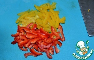 Перец ( красивее будут выглядеть разноцветные) вымыть, почистить и нарезать тонкими полосками.