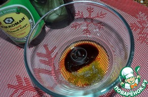 Приготовить заправку : оливковое масло смешать с перцем и 1 ст. л. соевого соуса.