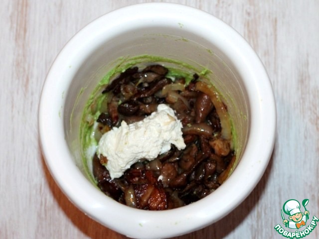 8. Выкладываем грибы в блендер, добавляем сыр (100 Г), прессованный чеснок, солим и перчим по вкусу и перемалываем в однородную массу.