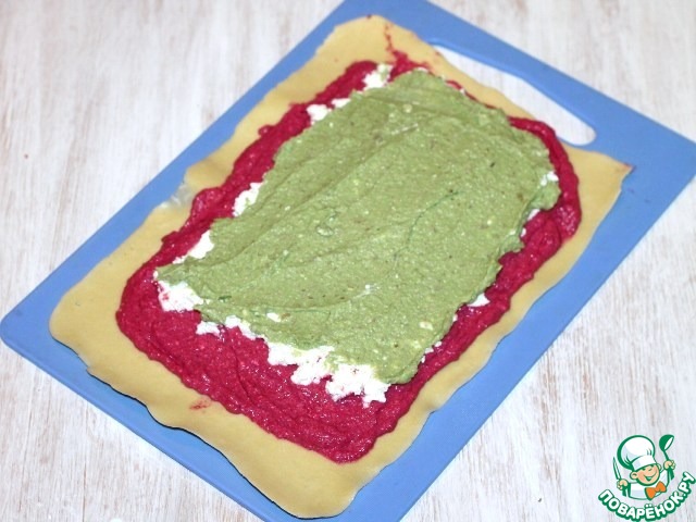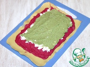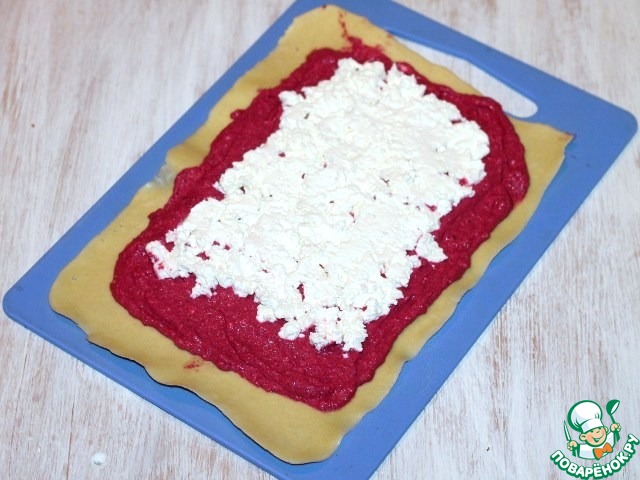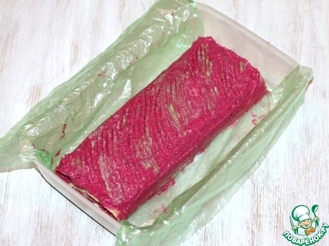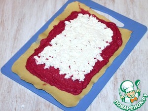 10. Разворачиваем корж, выкладываем свеклу, затем распределяем оставшейся сыр (200 г).