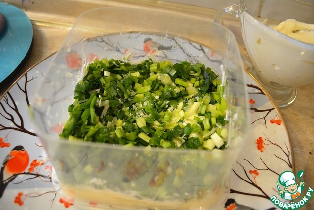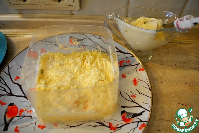 Укладываем в формочку слой сыра, смазываем заправкой, хорошенько утрамбовывая.
