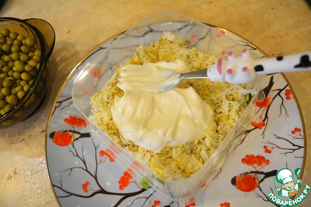 Натираем яйца и снова промазываем майонезом. Утрамбовываем - это нужно, чтобы салат хорошо держал форму.