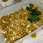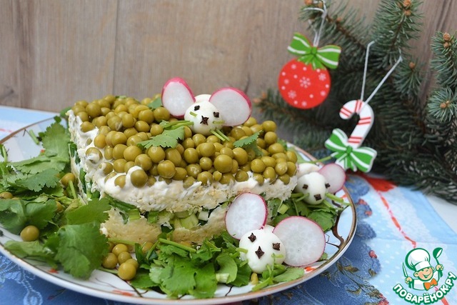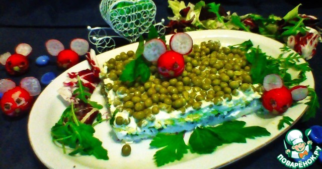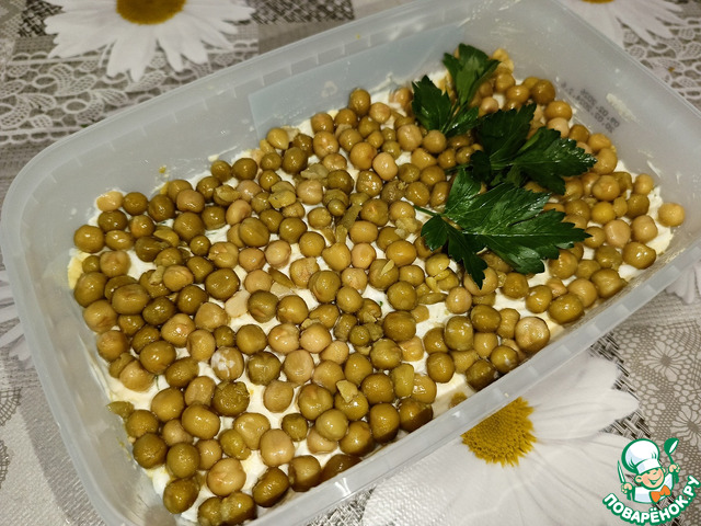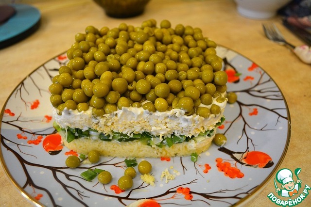 Затем слой зеленого горошка (обязательно хорошо слейте жидкость). Снимаем формочку...