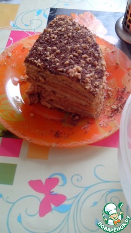 Сверху кладем медовый корж и чуть прижимаем руками, затем продолжаем собирать торт, чередуя коржи, смазывая кремом и посыпая каждый орехами. -