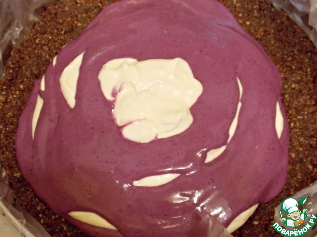 Вынимаем нашу основу из холодильника и наливаем поочередно черничный и белый слои.