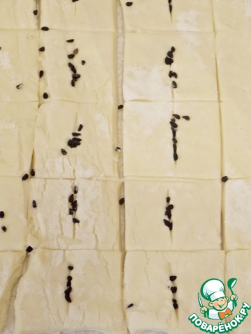 Слоеное тесто нарезать при помощи ножа для пиццы на квадратики 2*2. Сделать на половине квадратов разрез не доходя до краев и на прорезая дно. Смазать яйцом и посыпать разрез тмином.