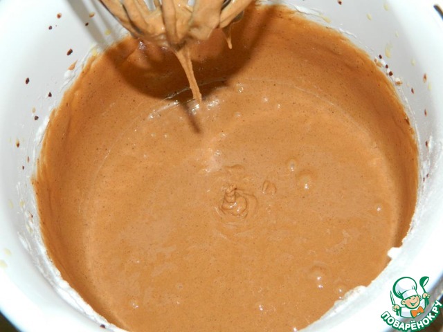 Добавляем растопленное сливочное масло, перемолотый и обжаренный миндаль, крахмал, муку, соду и какао.