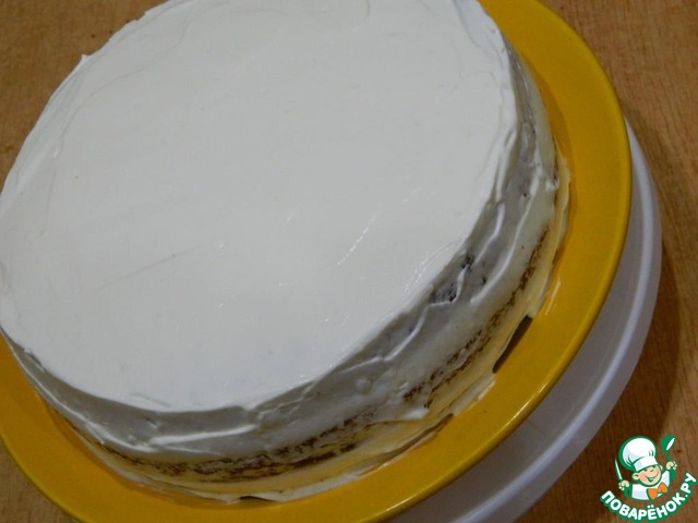 Пропитанные коржи смазываем кремом и раскладываем на крем вишню. Собранный торт убрать в холод, чтобы немного застыл.