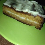 Готовый пирог я разрезала пополам и промазала абрикосовым джемом, сверху полила шоколадной глазурью и украсила орешками и кокосовой стружкой.