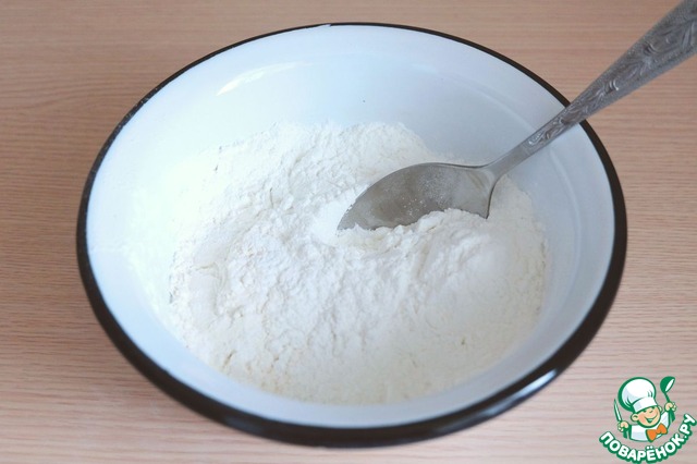В миске смешать муку (60 гр.) и крахмал (60 гр.).