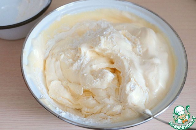 Бисквитное тесто аккуратно вымешать снизу вверх. -