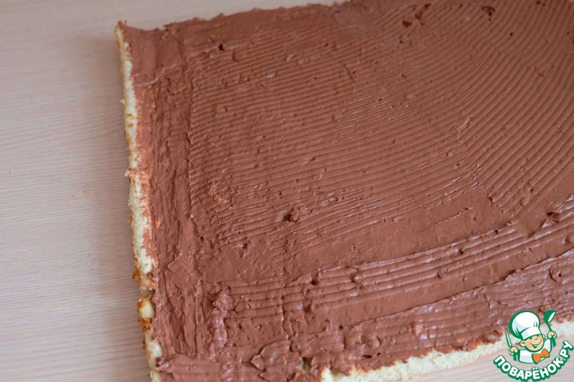 Бисквитный рулет развернуть в лист, нанести шоколадный крем, затем вновь свернуть в плотный рулет.