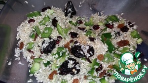 Порезать кубиками болгарский перец, перемешать с рисом и сухофруктами.