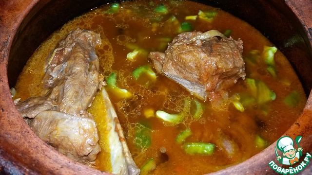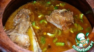Мясо с вечера помыть, нарезать на куски, сложить в глиняный горшок. Порезать полукольцами лук, мелко чеснок, черный перец. Отправляем к мясу, добавляем оливковое масло и вино. Хорошо перемешиваем и оставляем мариноваться мясо в холодильнике до утра.