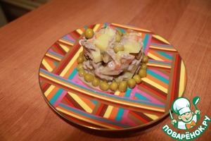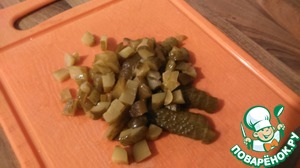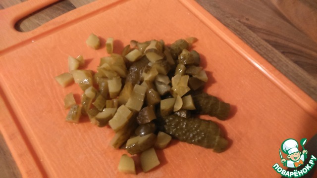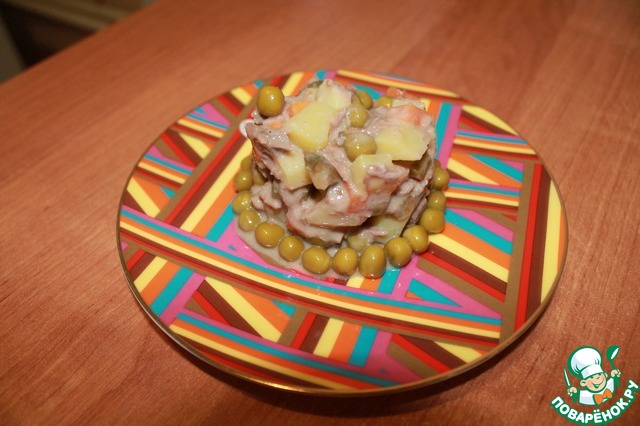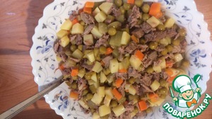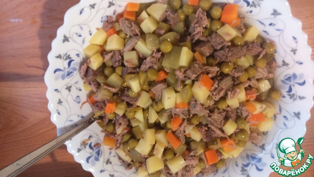 В большой миске соединяем мясо, картофель с морковью, консервированный горошек и соленые огурцы. Солим.