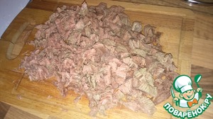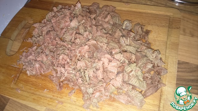 Нарезаем отварную говядину (после варки ее лучше оставить остывать в бульоне, тогда мясо будет сочнее).