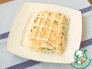 • Следующим слоем выложить свежий огурчик, немного посолить и смазать майонезом.