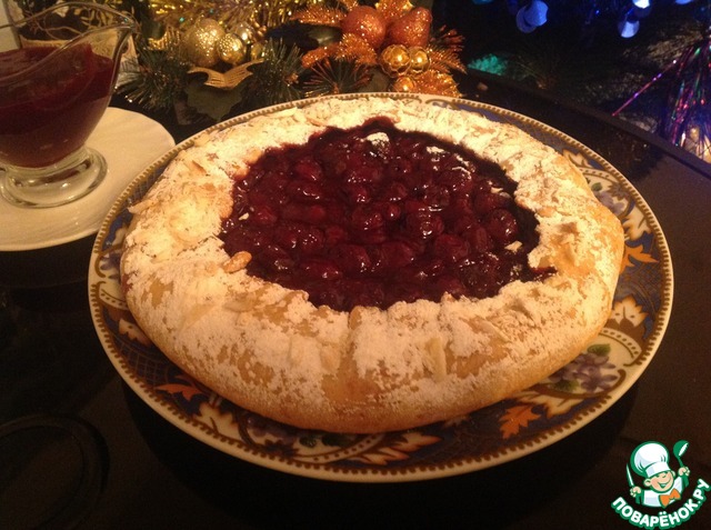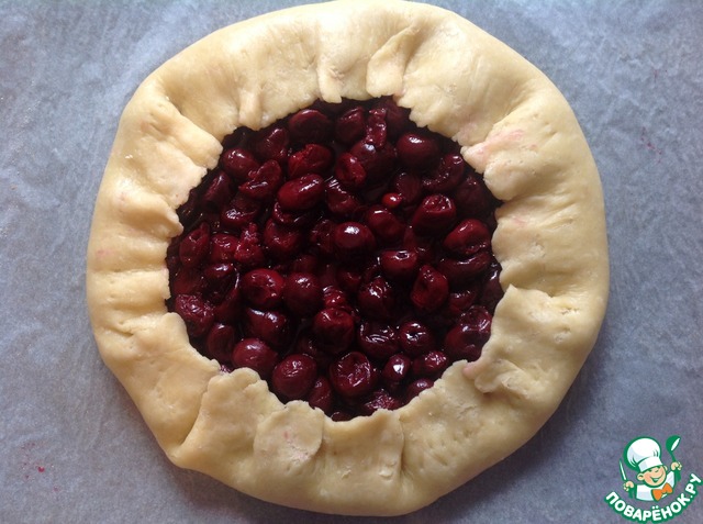 На середину коржа выкладываем вишневую начинку, отступив от краев 7-9 см.