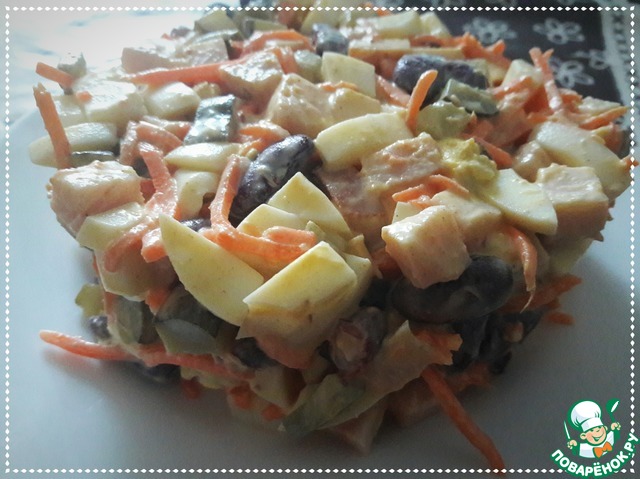 Добавить фасоль и корейскую морковку, перемешать и заправить все майонезом.