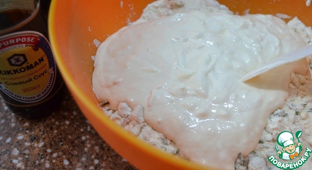 В миске смешать муку, соль, соду, жареный лук, горошек и кукурузу, рубленную зелень.