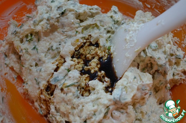 В миске смешать сметану, мягкий сыр, яйцо, соль, растительное масло, взбить.