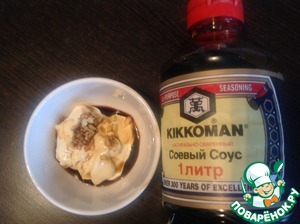 Имбирь натереть на мелкой тёрке, чеснок пропустить через пресс, добавить майонез и соевый соус (ТМ Киккоман), перемешать.