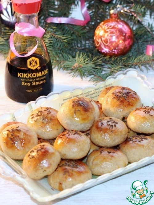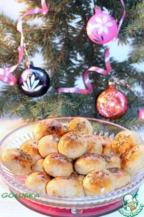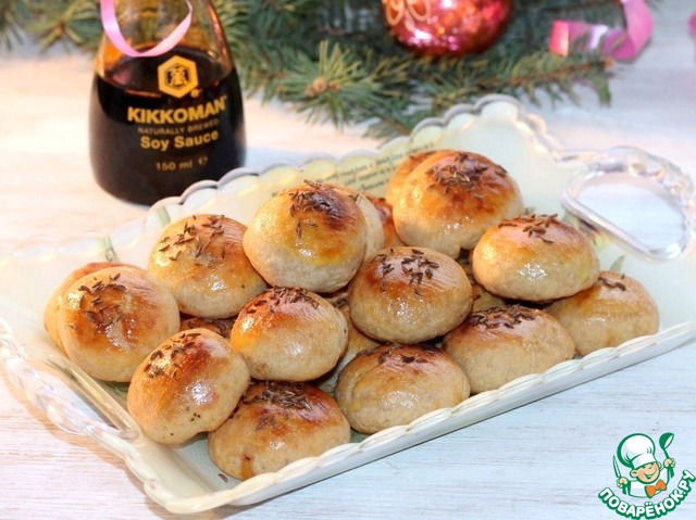 Смазываем булочки взбитым яйцом, посыпаем тмином и на 5 минут в духовку. Все это надо делать быстро, чтобы булочка не остыла. -