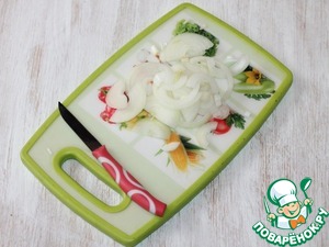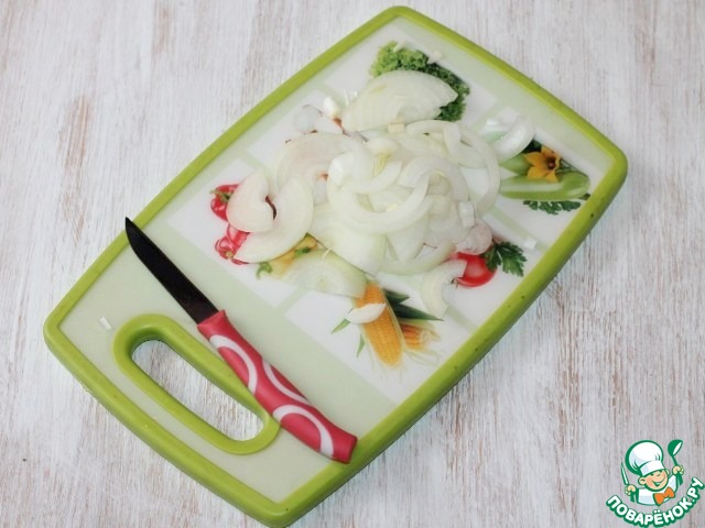 1. Очищенный и порезанный репчатый лук, обжарить на растительном масле до прозрачности.