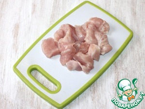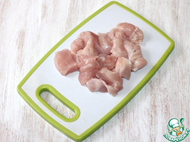 2. Добавить порезанное кусочками филе курицы, обжарить до бела.