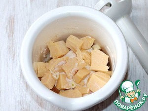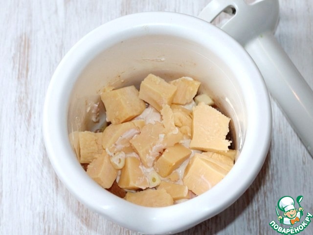 4. Выложить немного охлажденное филе курицы с луком в чашу блендера. Добавить порезанный ломтиками сыр, порубленный чеснок и молотый перец, измельчить.