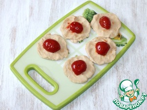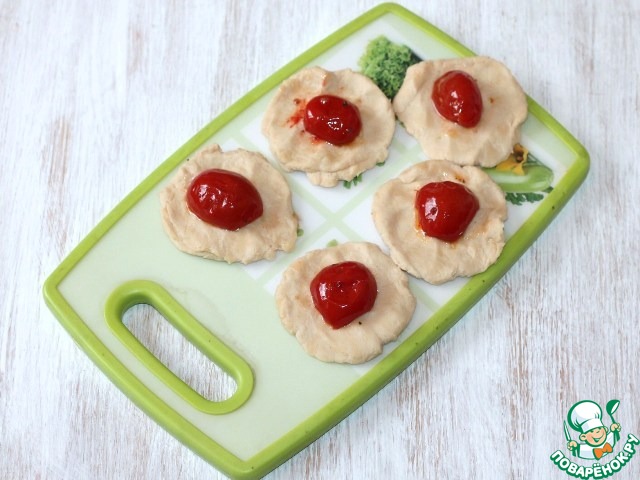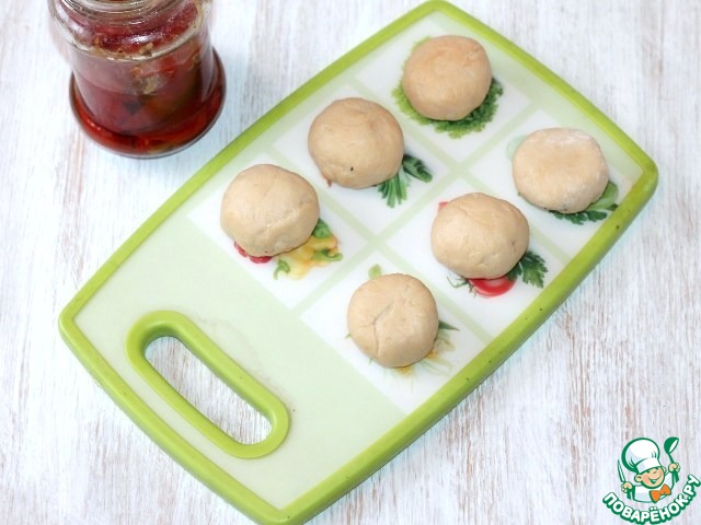 7. Припыляем столешницу мукой и формируем из 20 частей теста лепешки. Кладем на лепешку дольку вяленого помидорчика черри.