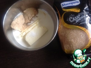 Для соуса в сотейник добавить сливочное масло, сливки, тростниковый сахар Демерара и щепотку морской соли.