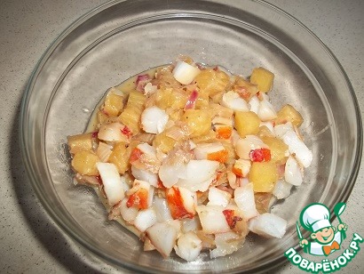В сковороде разогреть немного оливкового масла, слегка обжарить лук и ананас, добавить 1ст. л. соевого соуса и ананасовый сок, по щепотке смеси перцев и молотого кориандра.