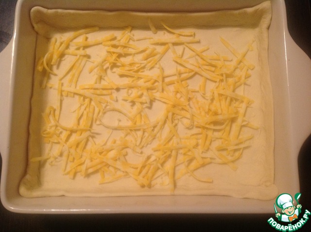 Одну часть раскатываем и укладываем на начинку, края хорошо защипываем. -