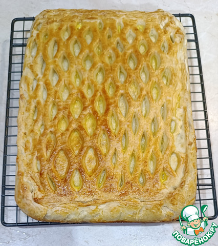 Сверху пирог смазать разболтанным с парой капель воды яйцом.