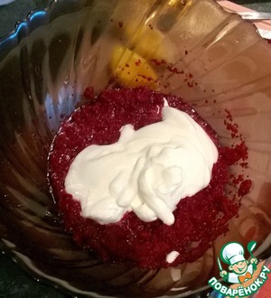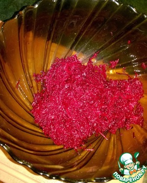 2. Свеклу натереть на мелкой терке, добавить к ней лимонный сок и уксус. Я использовала винный. -
