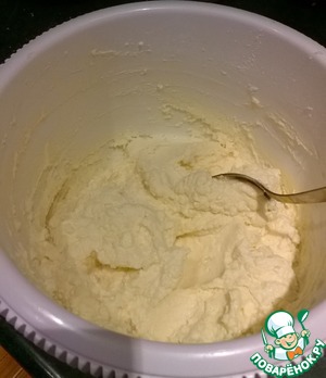 В это время яйцо и немного лимонной кислоты взбиваем, добавляем получившийся творог и еще взбиваем до однородной массы.
